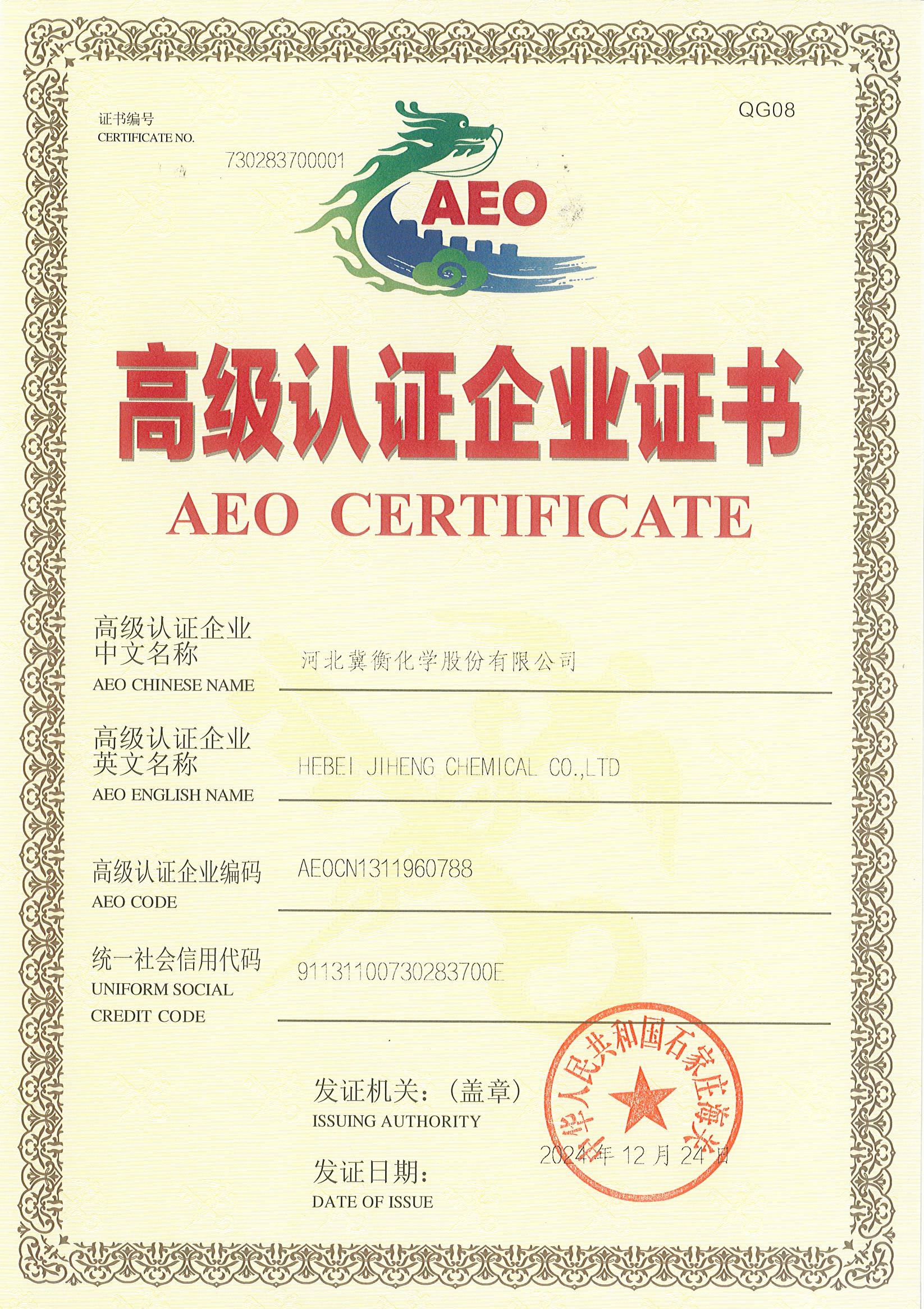 近日,河北冀衡化學股份有限公司取得了中華人民共和國石家莊海關頒發的《AEO高級認證企業證書》,公司被認證為AEO高級認證企業。